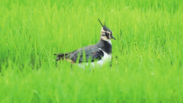 头戴凤冠、身披彩衣、脚登红靴,这群有着“天线宝宝”一样萌萌外表的鸟儿,号称鸟类“第一吃货”,目前被列入《世界自然保护联盟濒危物种红色名录》。镜头中,凤头麦鸡头顶细长黑色冠羽,背部羽毛泛着金属光泽,橙褐色双脚在田埂间轻快移动。作为中型涉禽,凤头麦鸡主要以蝗虫、蚯蚓等昆虫及植物种子为食,此次现身稻田也印证其“农田益鸟”的身份。