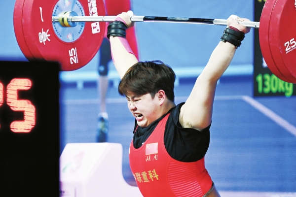11月13日,湖南队选手覃丽蓉在举重女子76公斤级挺举比赛中。