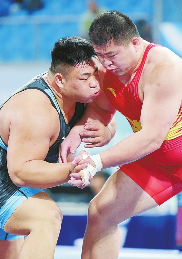 11月13日,湖南队选手江文豪(左)在摔跤男子古典式130公斤级比赛中。