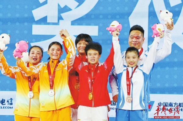 11月10日晚,在第十五届全运会举重女子49公斤级决赛中,侯志慧夺得冠军,为体育湘军拿下首块金牌。图为侯志慧(左四)在领奖台上。华声在线全媒体记者 傅聪 摄