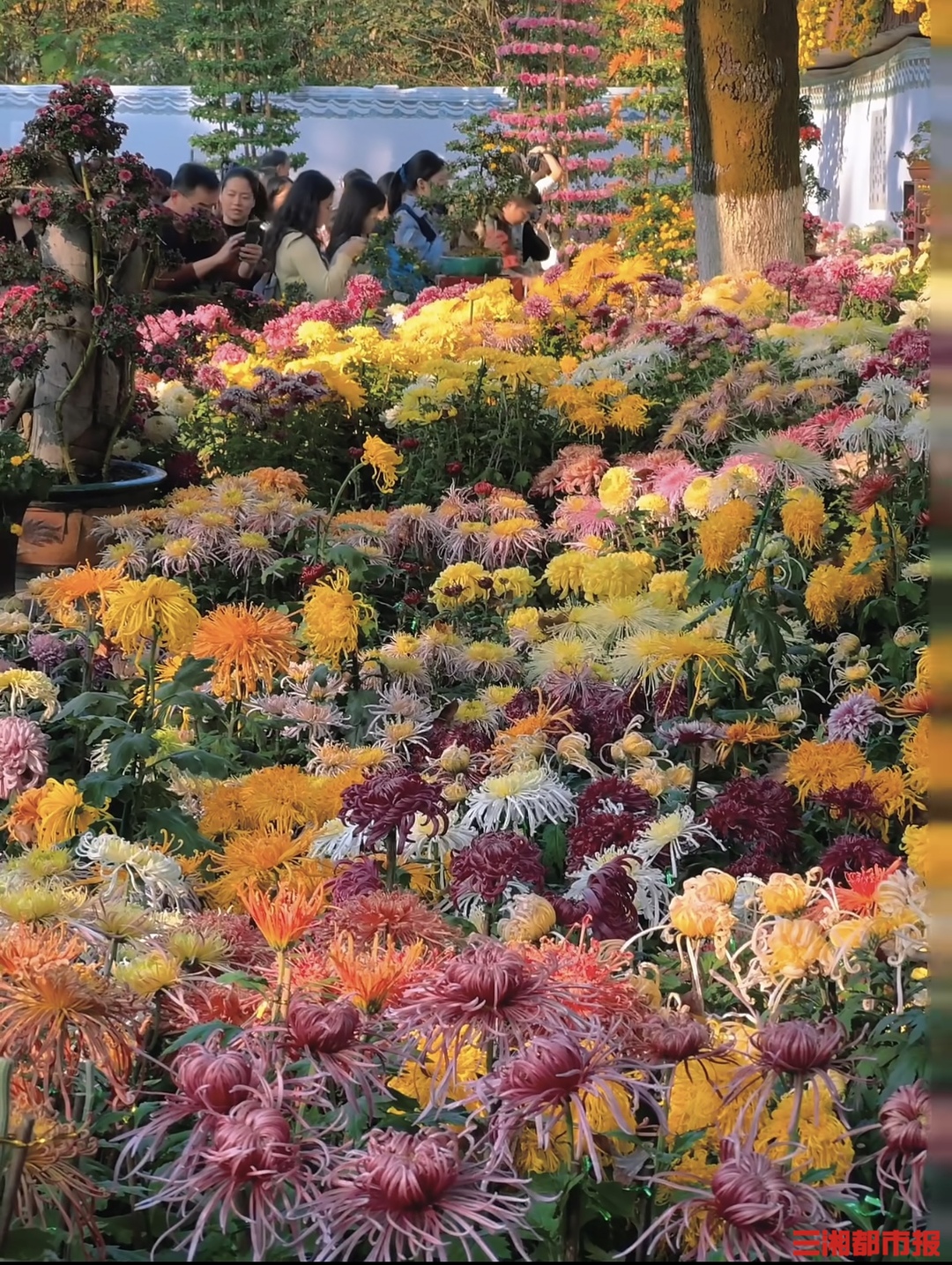 在东大门入口处,造型独特的菊扎景前排起长队,游客有序轮换位置,用手机记录菊花形态。“今年菊花品种多,特别是‘绿朝云’,花瓣层层叠叠像玉石雕的,很特别。”来自长沙县的周女士向记者展示照片时表示,她特意选周末早间错峰前来,“没想到人还是不少,能看出秋色受欢迎程度”。