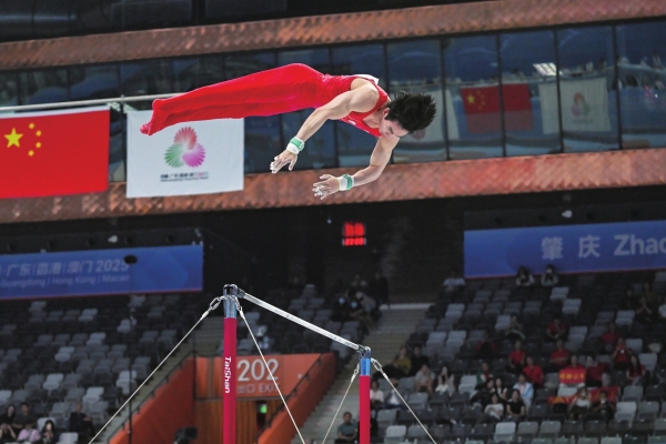 11月17日,张博恒在比赛中。华声在线全媒体记者 刘丰 叶竹 摄影报道华声在线广州11月17日电(全媒体记者 蔡矜宜)今天,十五运体操项目迎来收官日,湖南高速体操队“劳模”张博恒终于拼下自己的首枚全运会金牌!在当晚进行的男子单杠决赛中,张博恒凭借一套稳稳落地的高质量动作,拿到14.860分,夺得冠军!最终,他以1金4银的战绩,为自己的第二次全运之旅画上一个圆满的句号。