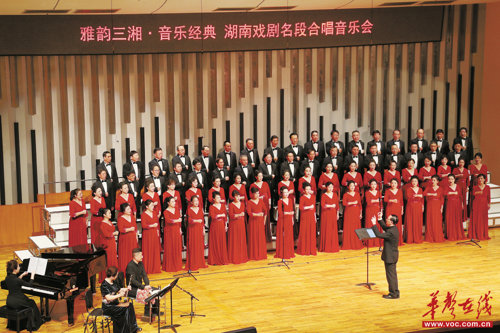11月30日晚,演员在合唱京剧《乘胜进军》。当天,“雅韵三湘·音乐经典”戏剧合唱音乐会在湖南音乐厅精彩上演。湖南艺术研究院知音合唱团创新性地将湘剧、花鼓戏、祁剧、巴陵戏等传统戏曲名段改编为合唱作品,以现代音乐语言诠释湖湘戏曲文化,推动传统文化创新性发展。