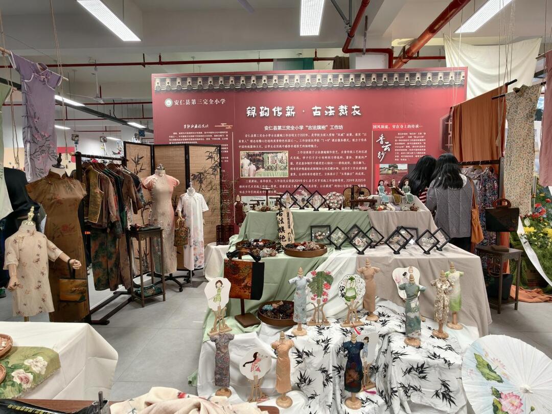 展会现场,学生们精心制作的古法旗袍作品及各类手工盘扣饰品,既浸润着纯真童趣,又严谨传承技艺,立体展示了学校“五育融合”的育人成果,吸引了众多观众驻足。一旁的体验区更是人气火爆,让参与者亲身感受到传统手工艺的匠心独运。