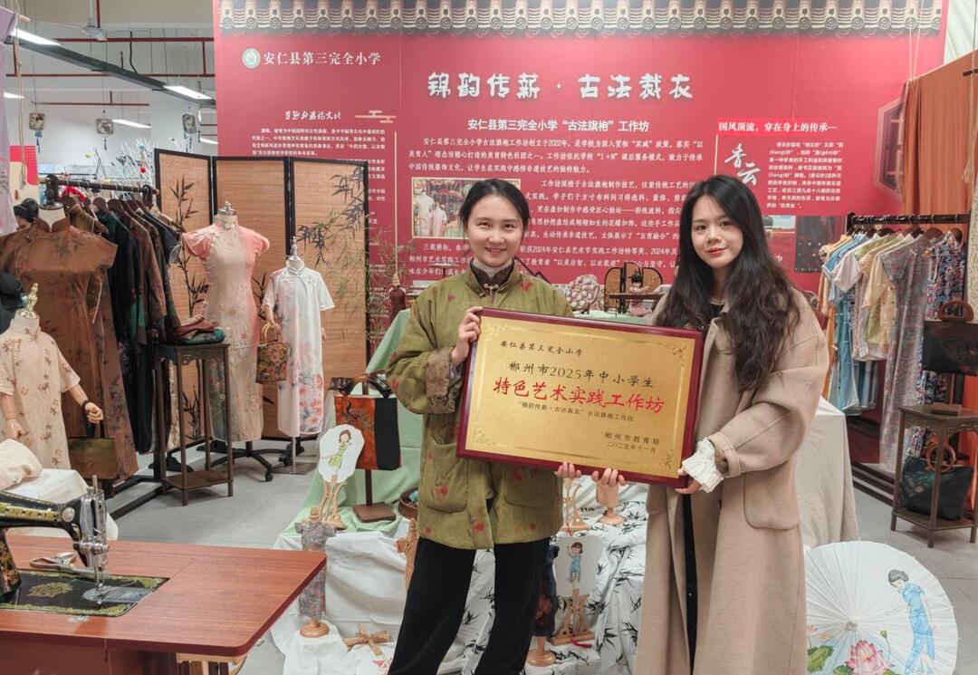 三载耕耘,春华秋实。学校古法旗袍工作坊已发展成为学校美育教育的亮丽名片,先后荣获2024年安仁县艺术节实践工作坊特等奖、2024年及2025年郴州市艺术实践工作坊一等奖,体现了教育者“以美启智、以衣载道”的初心与坚守。