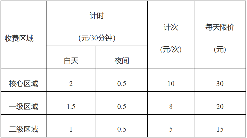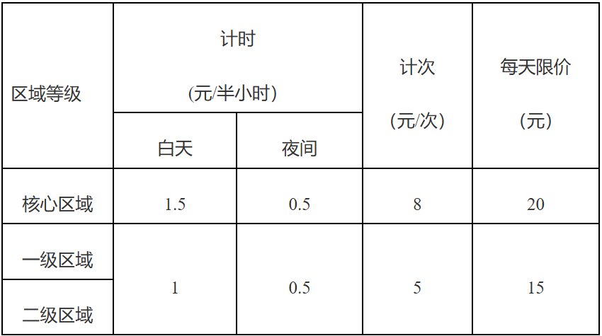 依据车辆停放密度及区域功能定位,市城区停车收费区域分为核心区域、一级区域、二级区域(收费区域图见附件)。