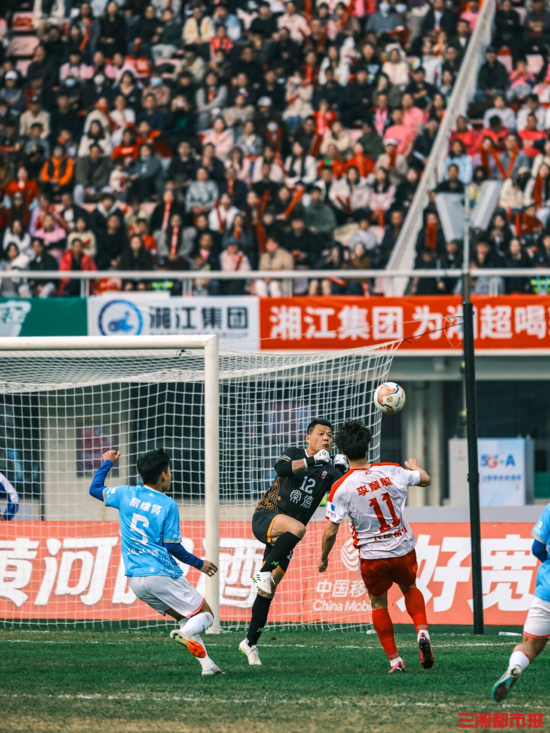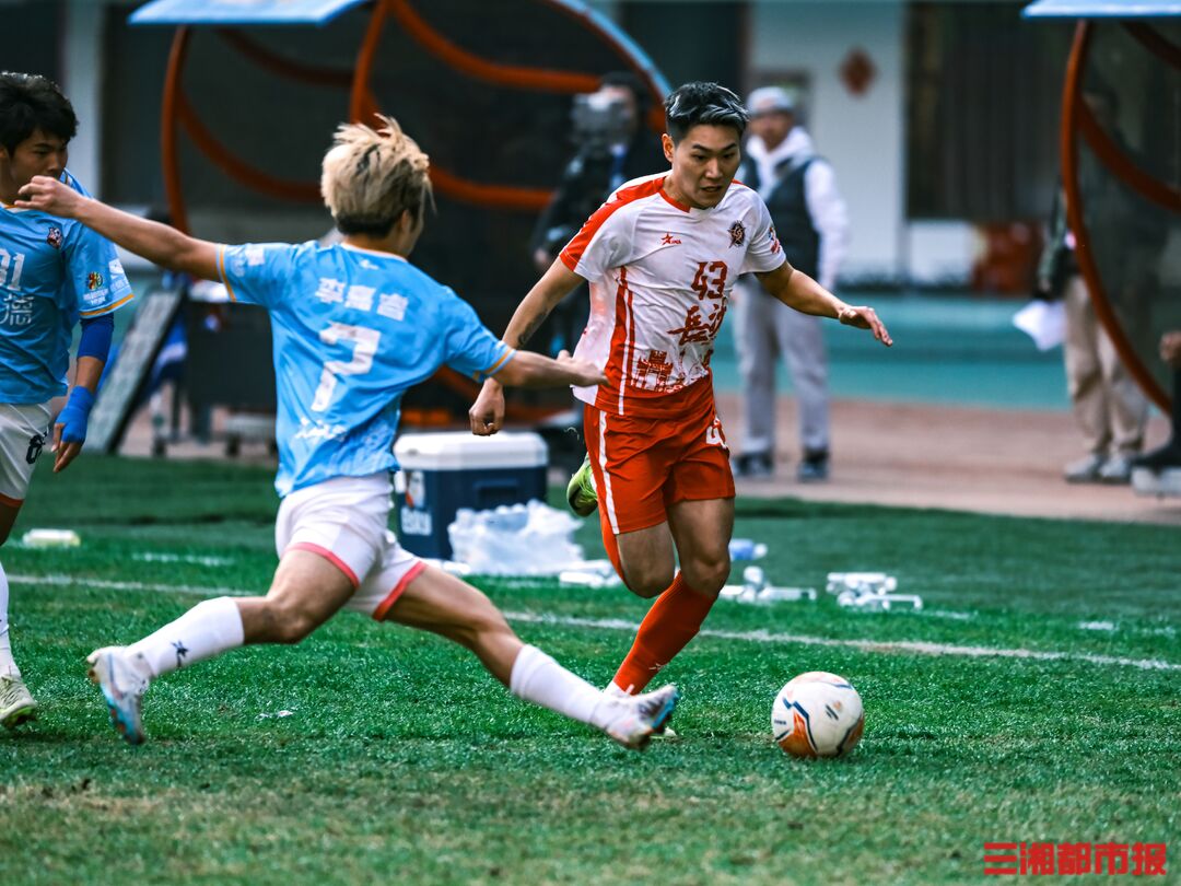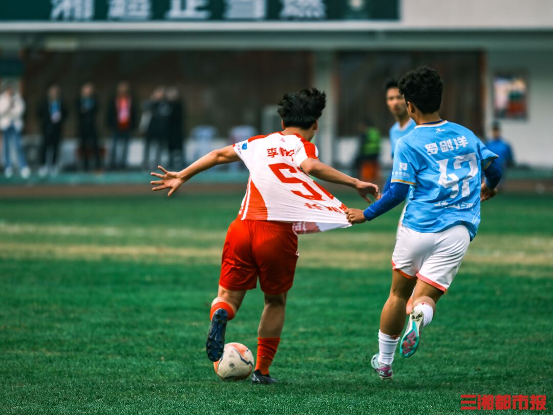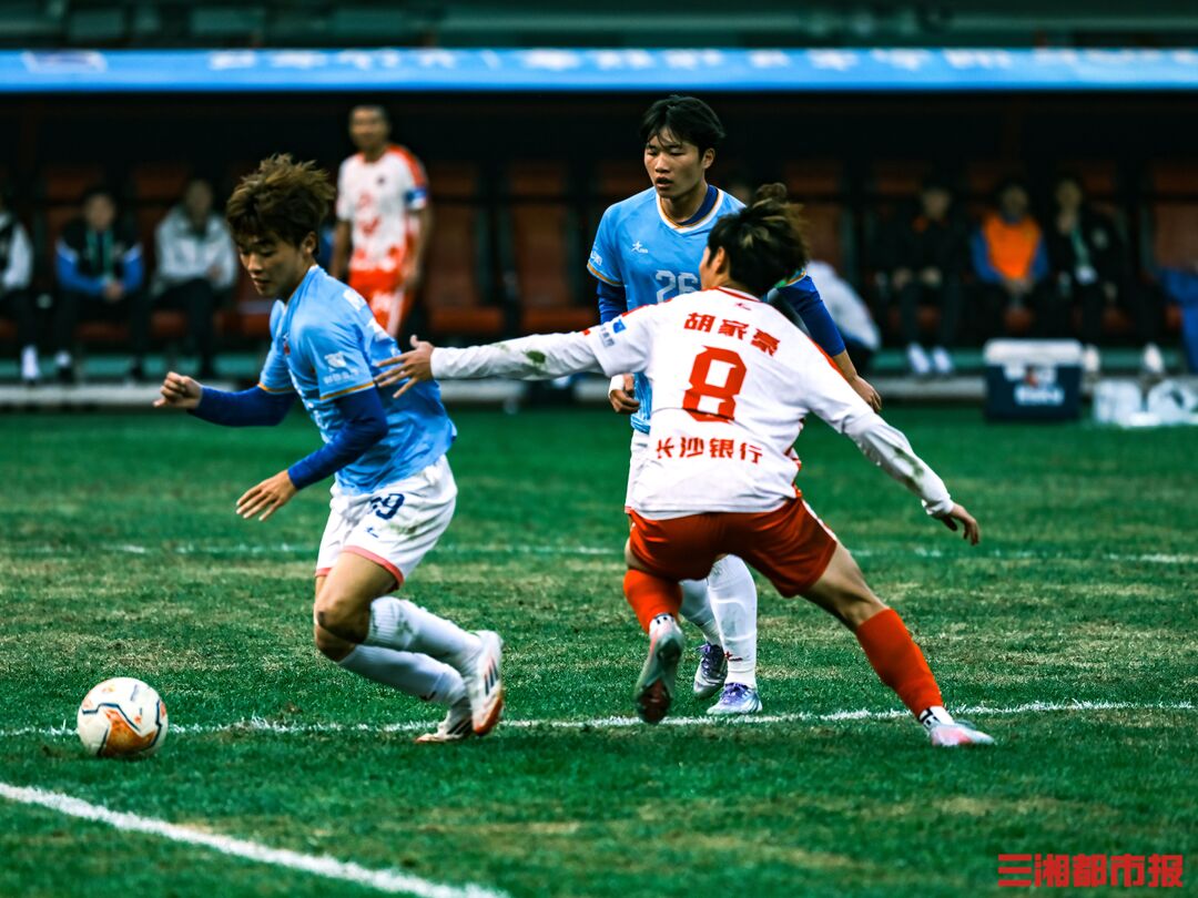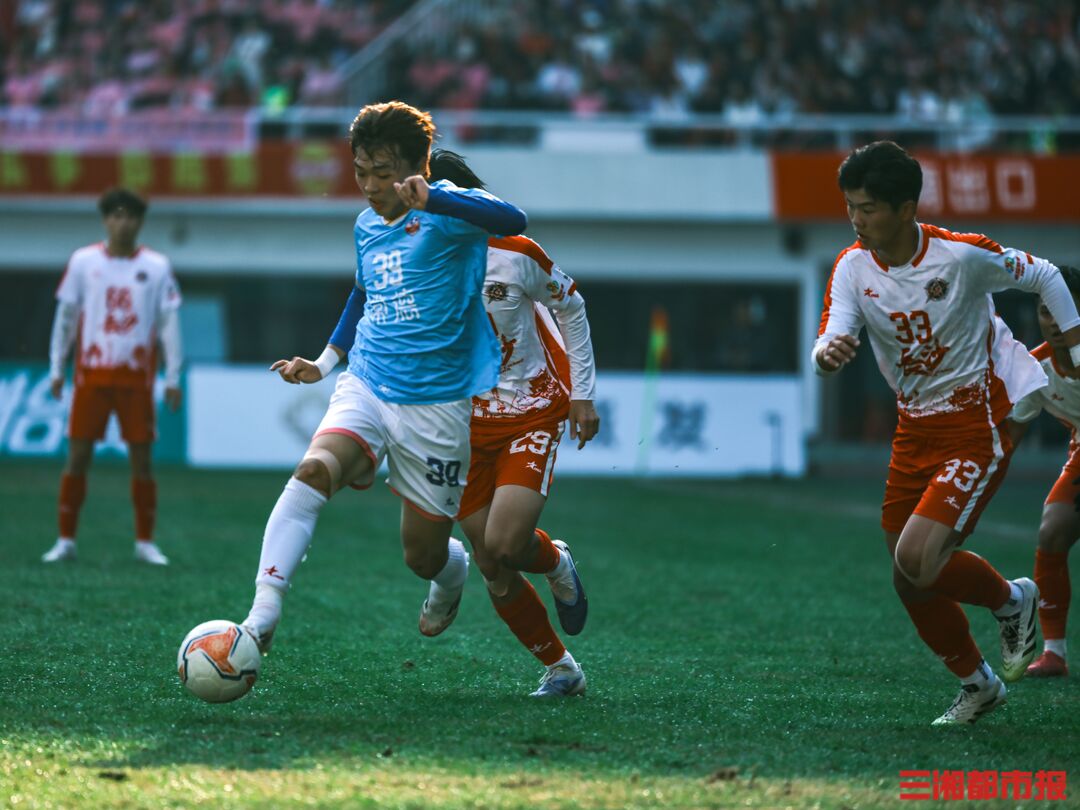12月6日下午,湘超联赛第十三轮也是常规赛最后一轮的七场比赛同时开踢,长沙队在主场贺龙体育场迎战常德队。凭借谭想和陈琪的进球,长沙队2比1力克常德队,以11胜2平的不败战绩结束常规赛。下周六晚7时38分,长沙队将继续坐镇贺龙体育场,在淘汰赛四分之一决赛中迎战第八名岳阳队。(全媒体记者 刘丰 叶竹 摄)
