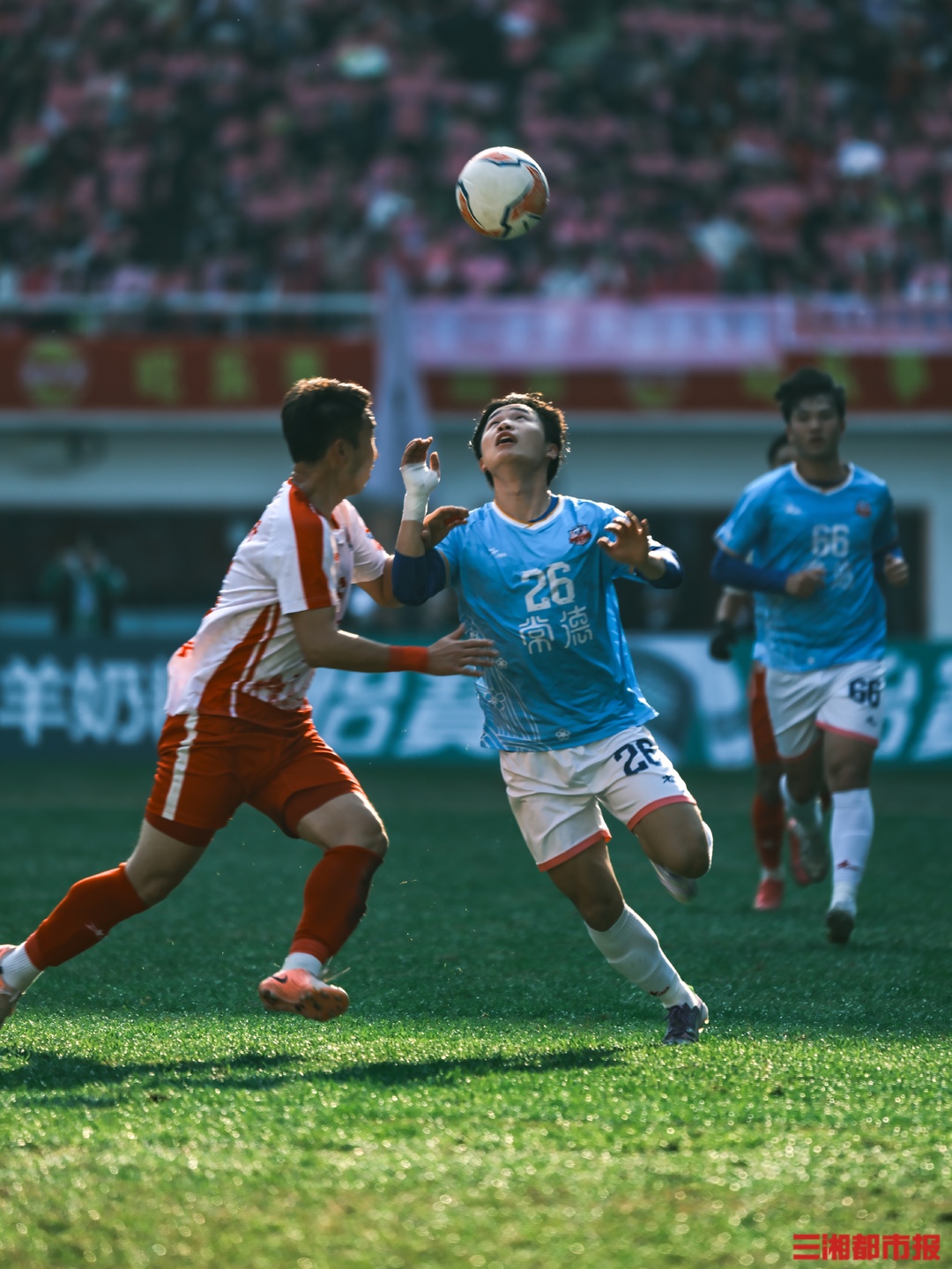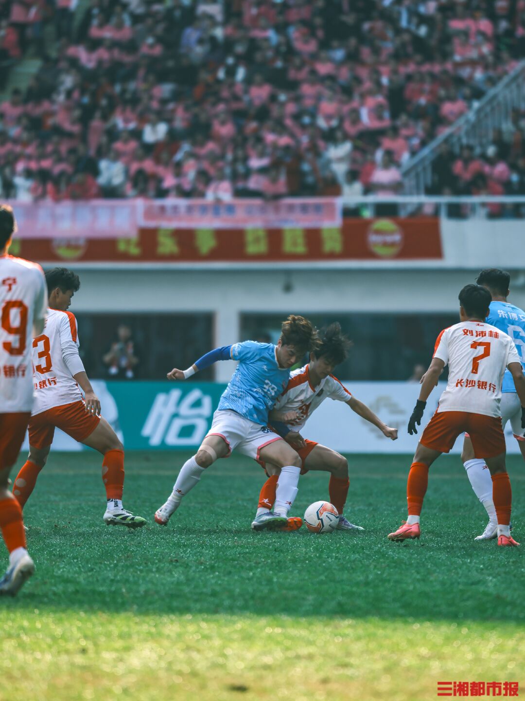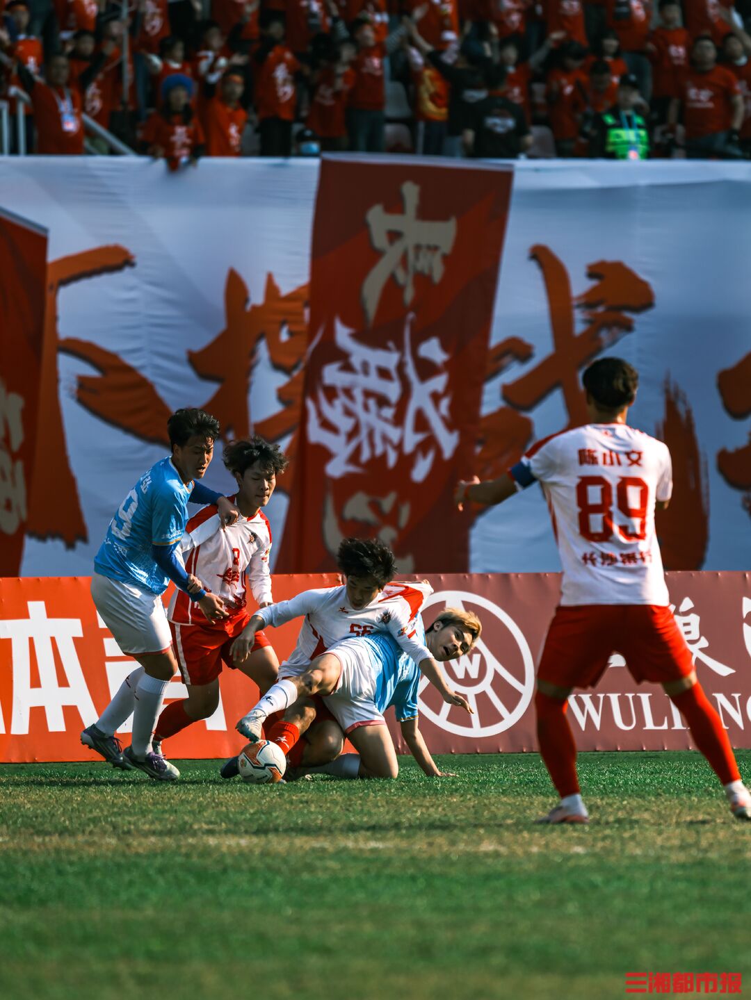 12月6日下午,湘超联赛第十三轮也是常规赛最后一轮的七场比赛同时开踢,长沙队在主场贺龙体育场迎战常德队。凭借谭想和陈琪的进球,长沙队2比1力克常德队,以11胜2平的不败战绩结束常规赛。下周六晚7时38分,长沙队将继续坐镇贺龙体育场,在淘汰赛四分之一决赛中迎战第八名岳阳队。(全媒体记者 刘丰 叶竹 摄)