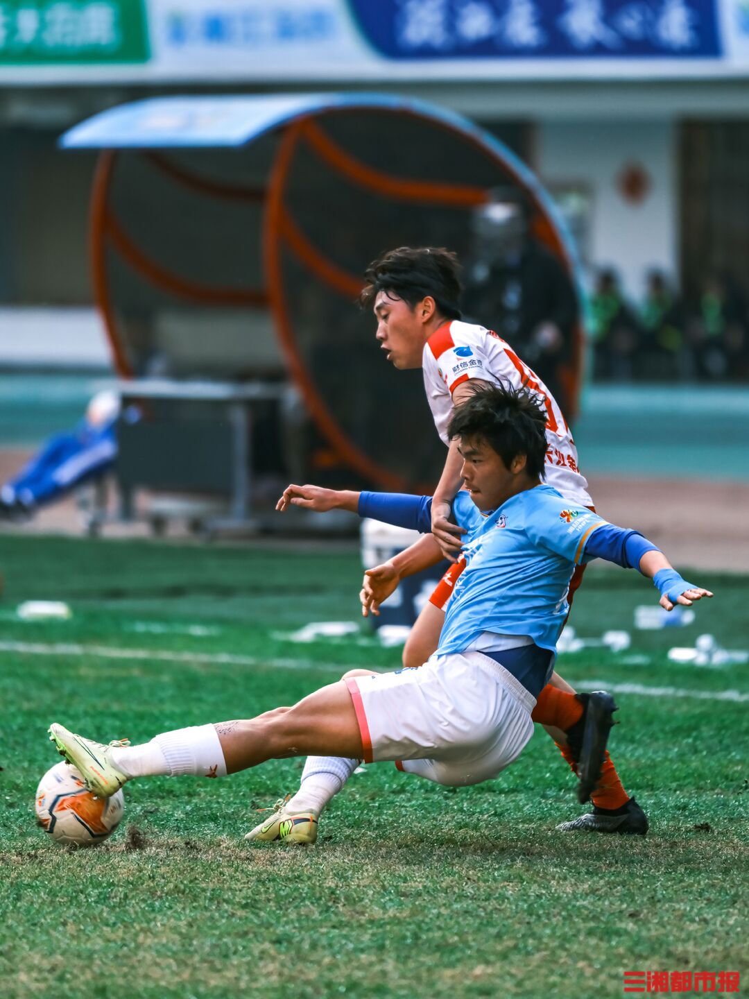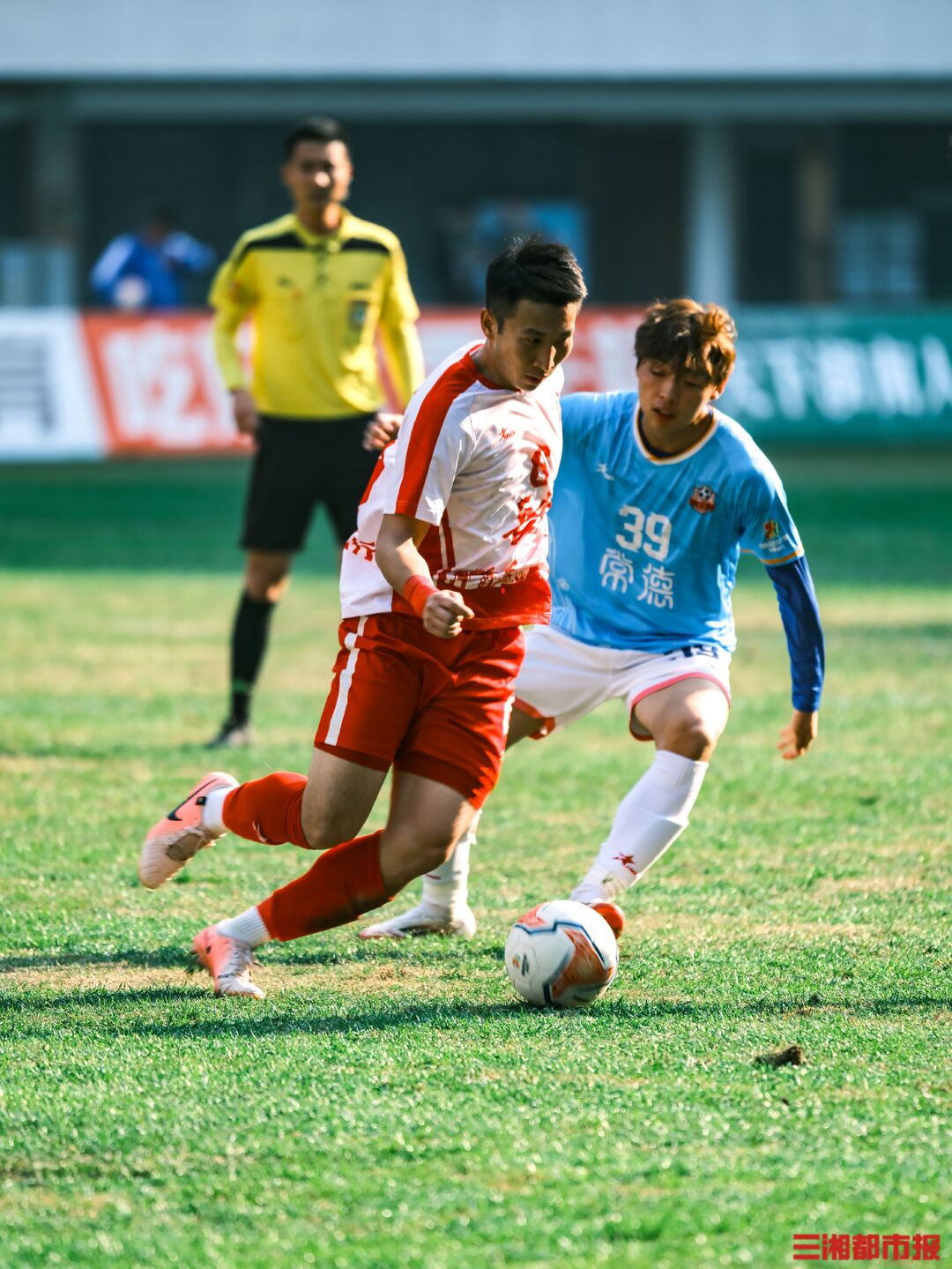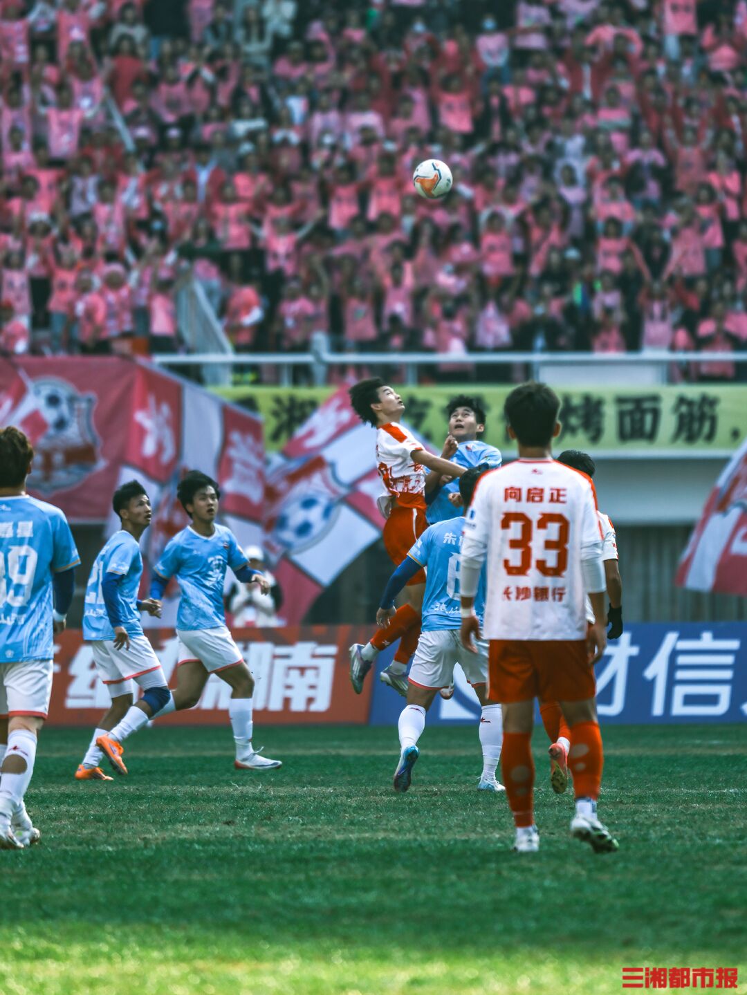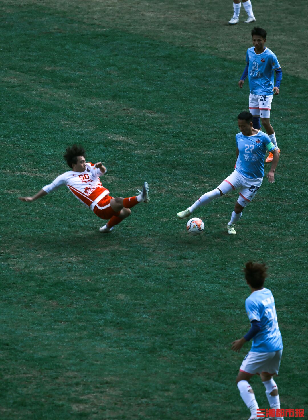 12月6日下午,湘超联赛第十三轮也是常规赛最后一轮的七场比赛同时开踢,长沙队在主场贺龙体育场迎战常德队。凭借谭想和陈琪的进球,长沙队2比1力克常德队,以11胜2平的不败战绩结束常规赛。下周六晚7时38分,长沙队将继续坐镇贺龙体育场,在淘汰赛四分之一决赛中迎战第八名岳阳队。(全媒体记者 刘丰 叶竹 摄)