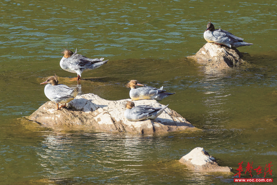 12月5日,汨罗江平江县瓮江镇段,中华秋沙鸭在此嬉戏。经观测,中华秋沙鸭种群数量达48只,这是近5年来汨罗江平江县段首次发现如此规模的中华秋沙鸭种群。