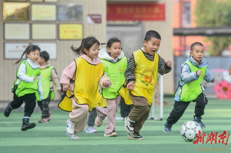 12月9日,道县城东幼儿园,小朋友在进行足球对抗赛。当天是世界足球日,当地中小学校、幼儿园组织丰富多彩的校园足球活动,让学生们接触足球、认识足球,在运动中感受足球带来的快乐。蒋克青 张娅 摄影报道(湖南图片库)