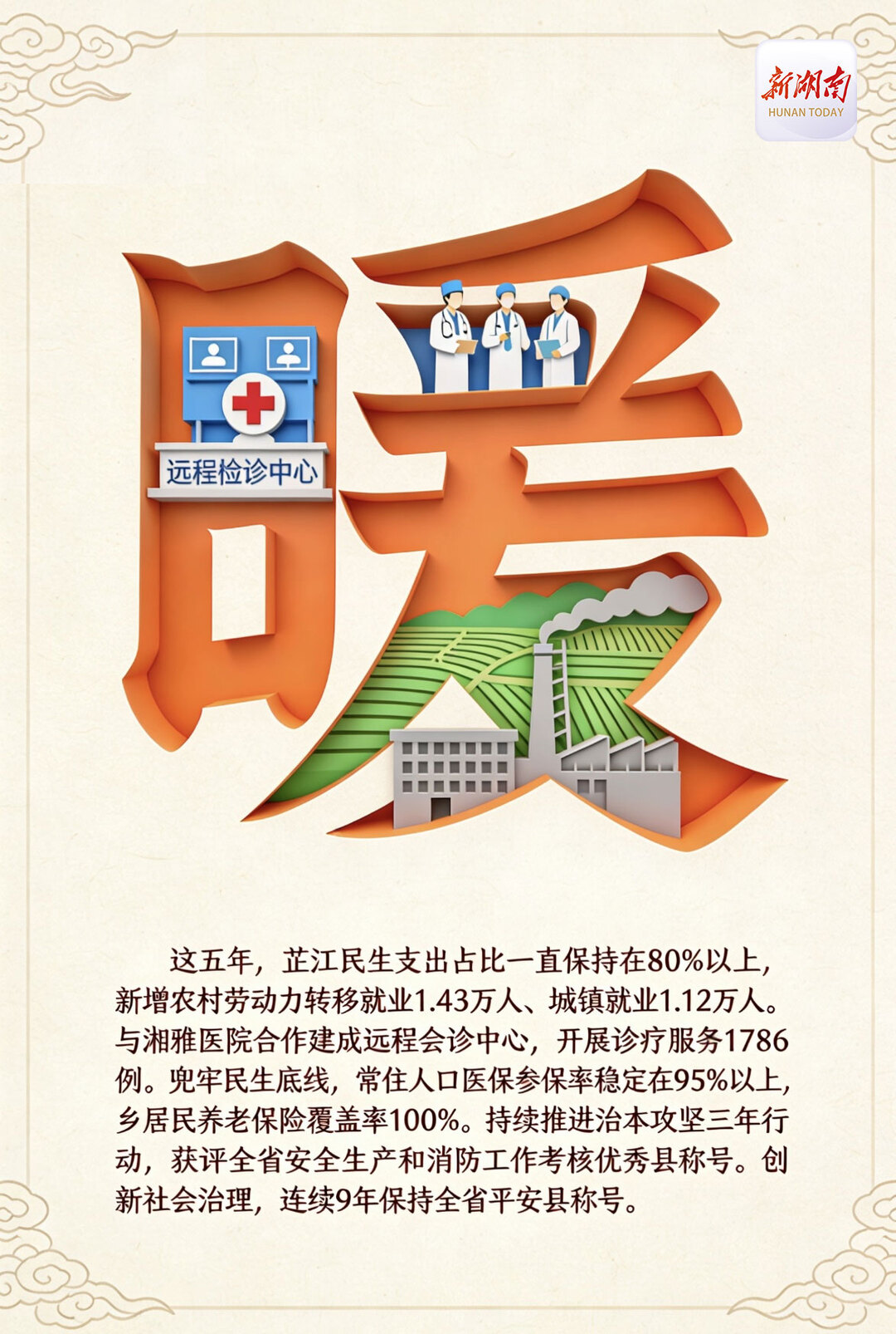 扎实推进紧密型县域医共体建设,与湘雅医院合作建成远程会诊中心,开展诊疗服务1786例。兜牢民生底线,常住人口医保参保率稳定在95%以上,城乡居民养老保险覆盖率100%。