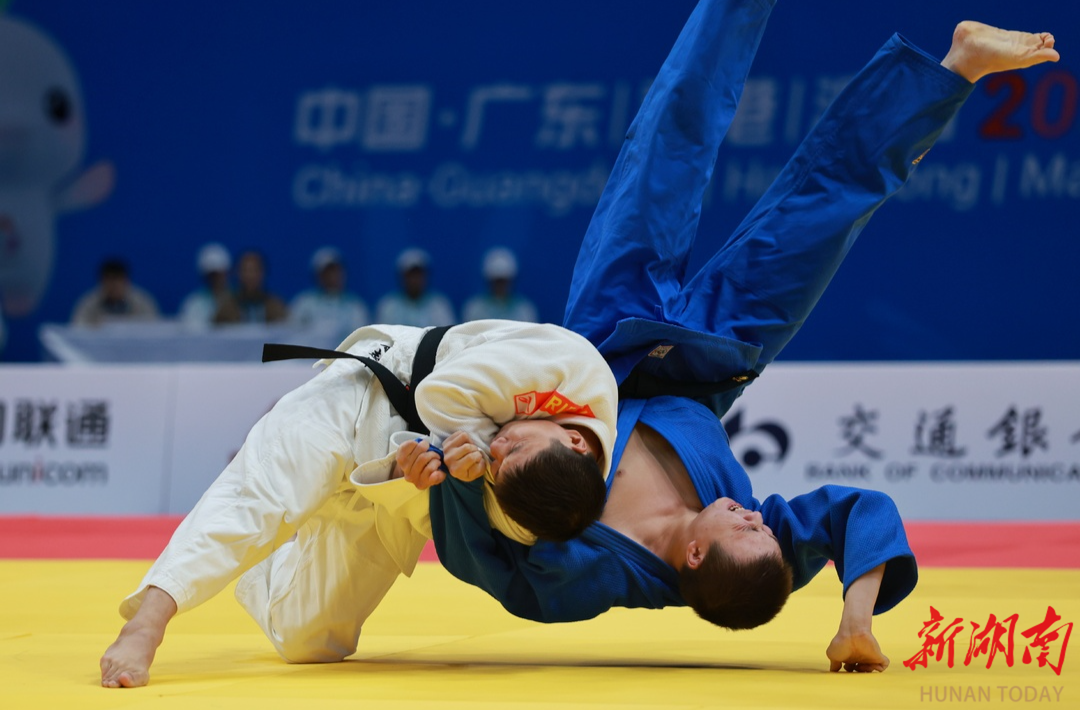 ▲12月10日,在男子J1-81公斤级决赛中,29岁的长沙小伙周志伟(左)以压倒性比分拿下一金。湖南日报全媒体记者 傅聪 摄