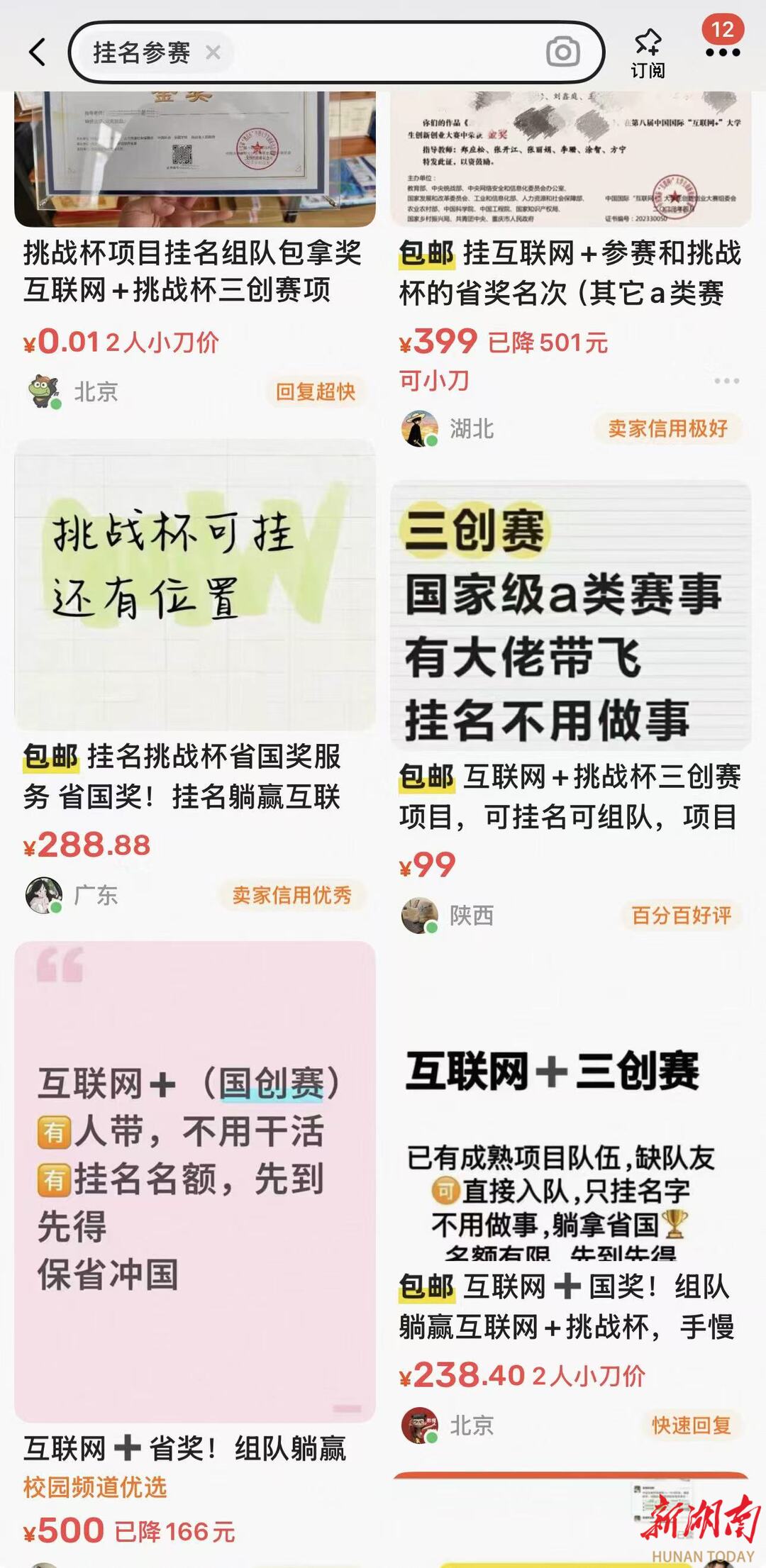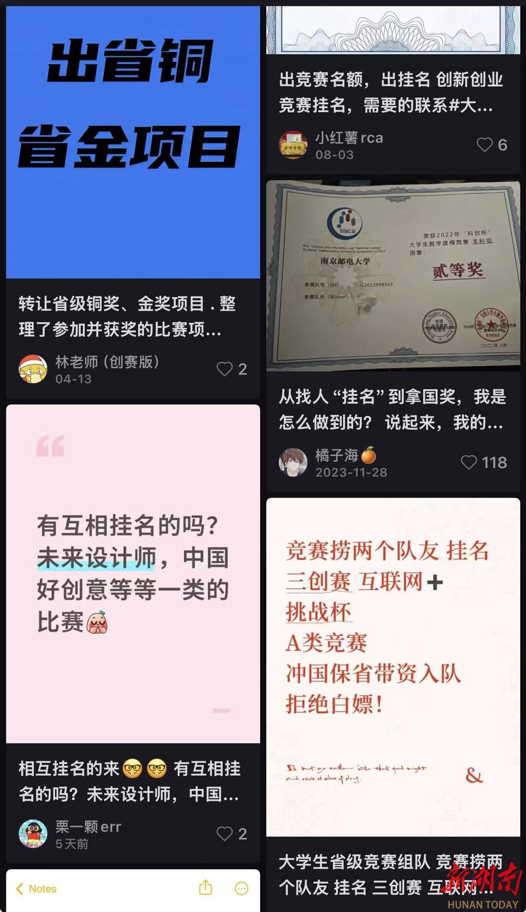 一名大三学生说,曾在校园论坛、社交平台都有看到过“竞赛组队”的帖子,点击联系后对方却表示“无需参与研究,缴纳3000元即可确保省奖”。网上这类信息很多,价格在从数千元到数万元不等,部分甚至宣称“保省级奖项可议价,国家级奖项需加价”,这种现象在校园论坛、社交平台等渠道尤为常见。