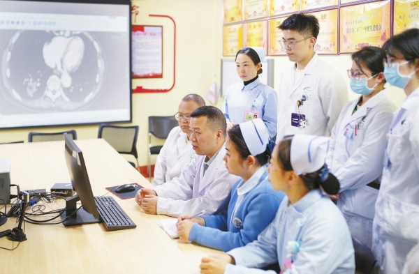 12月4日,湘潭市中心医院,呼吸与危重症医学科主任蒋明彦(前排左二)与科室同事齐聚,共同讨论患者病情。