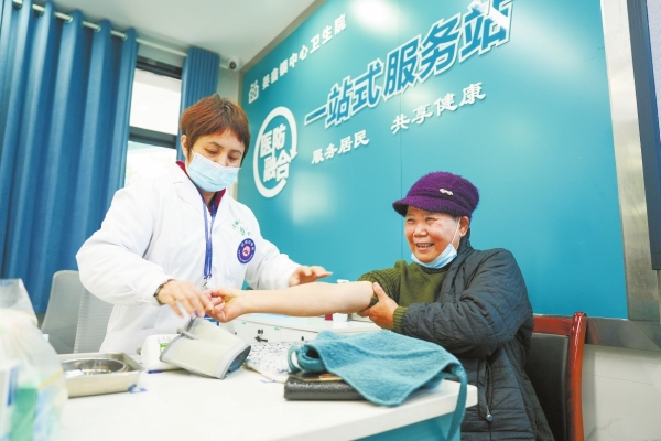 12月4日,湘潭市雨湖区姜畲镇中心卫生院的一站式服务站内,医护人员为村民测量血压。
