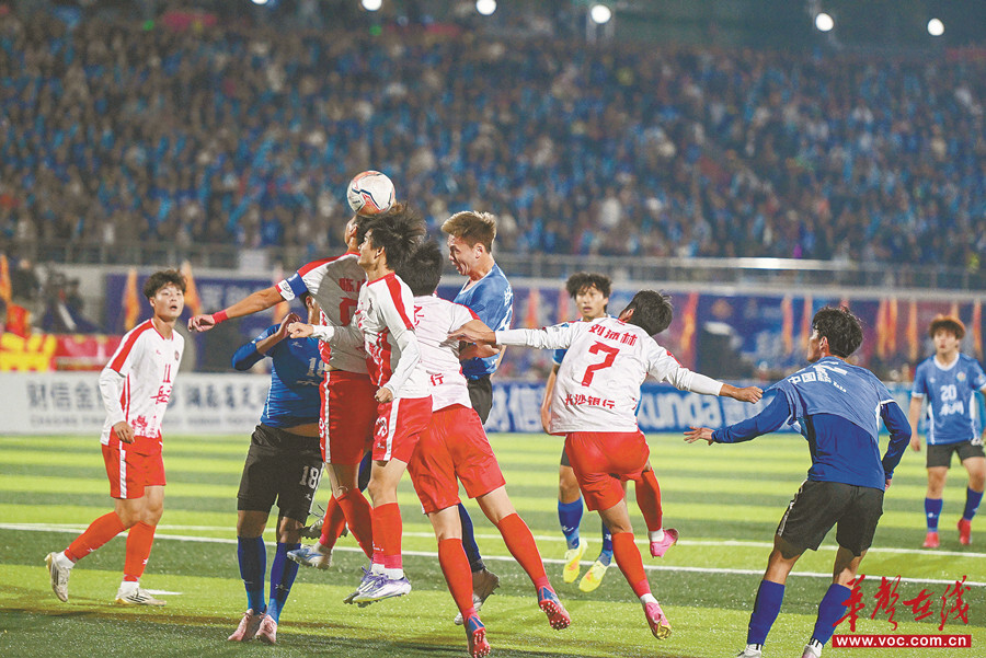 10月26日晚,双方球员在比赛中激烈对抗。当天,湘超联赛永州队主场出战,率先攻破长沙队球门,打破长沙队零失球纪录。