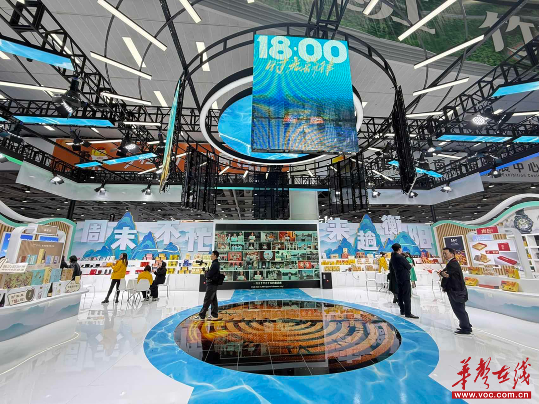 衡阳馆以“周末不忙,来趟衡阳”为主题,突破传统展陈方式,用“六个时辰”串联起雁城文旅精华。展位中心设有沙画表盘舞台,搭配科技感十足的透明冰屏,配合循环播放的特色内容与沉浸式表演,将时间线索转化为可触可感的游览体验。参观者沿向心式动线漫步,既能触摸历史底蕴,又能感知现代活力,仿佛身临其境走入衡阳的山水人文之中。