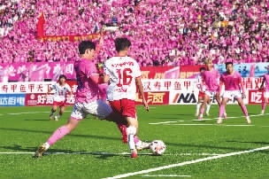 12月14日下午,双方队员在激烈比拼。当天,2025湘超联赛1/4决赛火热上演,常德队(粉)主场对阵衡阳队。经过紧张刺激的鏖战,终场哨响,常德队1∶0战胜衡阳队,率先挺进四强!
