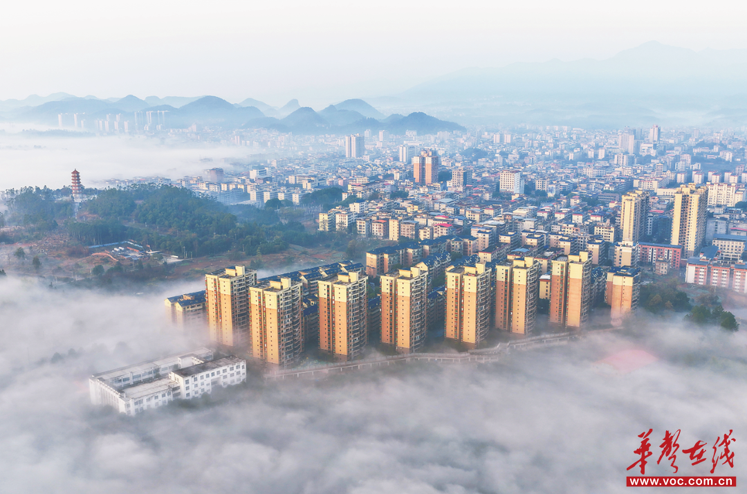 12月26日清晨,嘉禾县城笼罩在平流雾中,高楼、桥梁在氤氲雾气中若隐若现,呈现海市蜃楼般的奇幻景致。