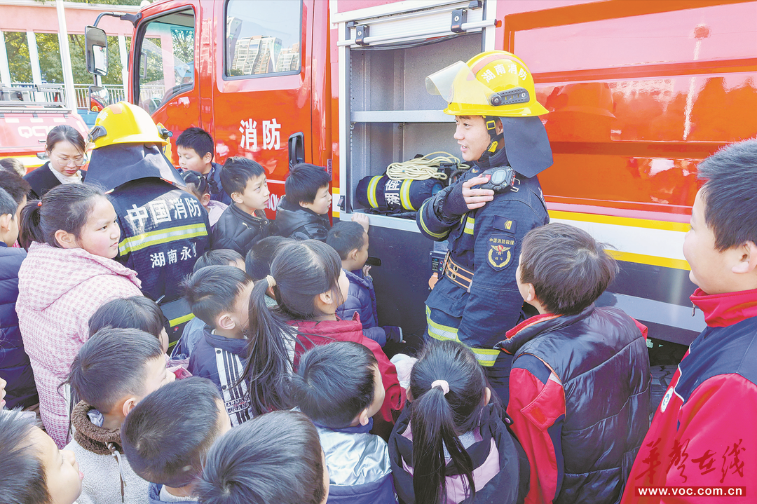 12月26日,学生在参观消防装备。当天,永州市冷水滩区消防救援大队宣传服务队走进银象小学,开展消防安全培训演练活动,切实提升该校师生消防安全意识和应急避险能力。