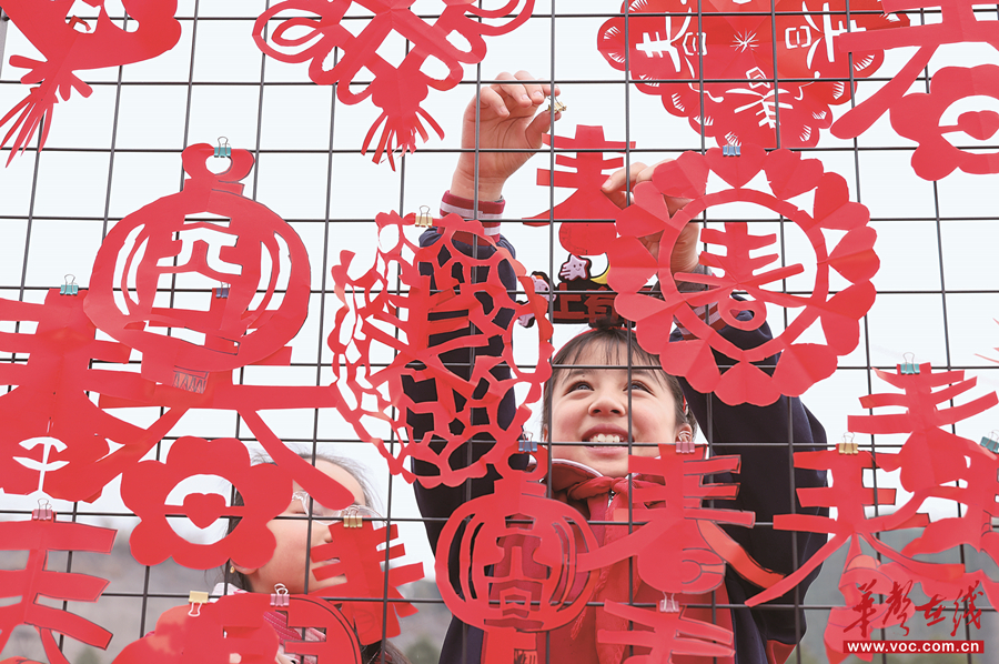 2025年12月30日,通道侗族自治县礼雅小学,小朋友在挂剪纸迎新年。粟勇主 摄(湖南图片库)