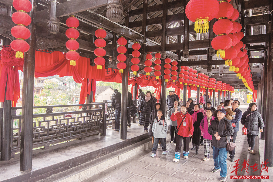 1月1日,永顺县芙蓉镇景区,游客行走在挂满灯笼的风雨桥上,感受浓浓的节日氛围。吴永华 摄(湖南图片库)