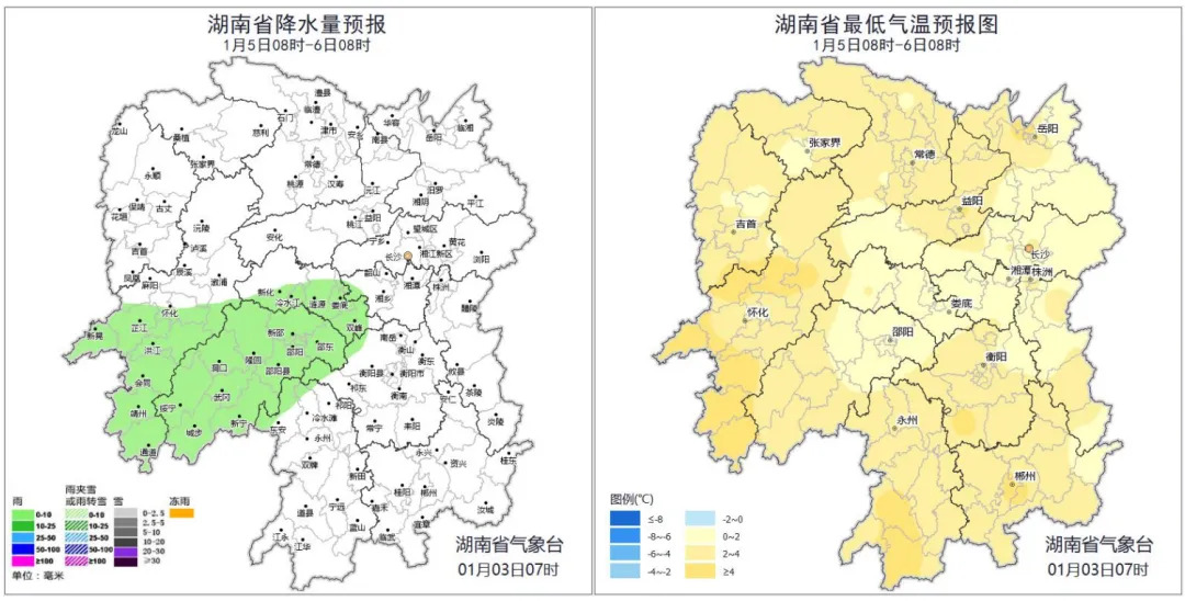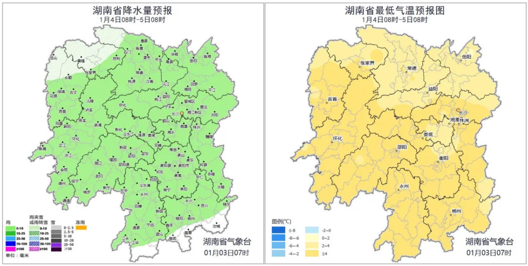 4日白天至晚上,湘北小雨转阴天,其中湘西北局地有雨夹雪或小雪,其他地区阴天有小雨;北风2~3级;最低气温湘北2~4℃,其他地区4~6℃;最高气温湘南10~12℃,其他地区6~9℃。