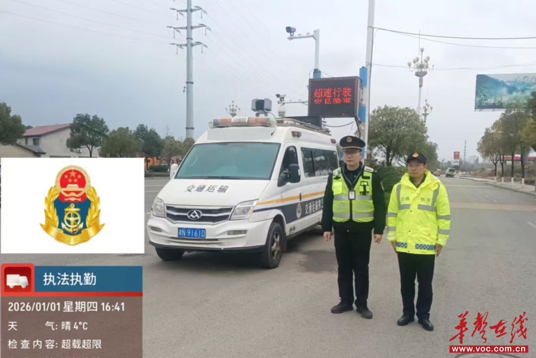 1月2日,岳阳市交通运输综合行政执法支队调集精干执法力量,联合公安交管部门在市湘北大道、君山高速出口等重点路段,对货运车辆进行检查,确保节日期间人民群众平安出行。(供图:赵立文)