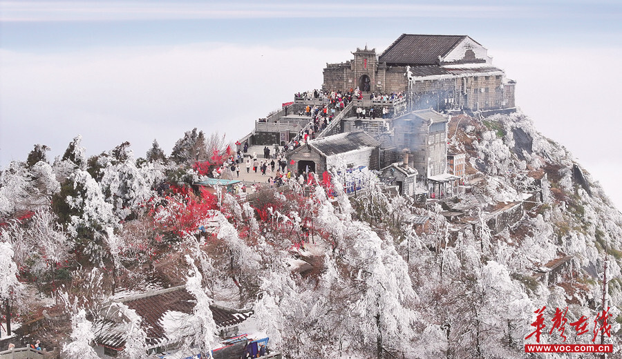1月3日,南岳衡山风景区雪后初霁。晶莹雾凇凝结枝头,翻腾云海漫卷群峰,吸引众多游客前来观赏。
