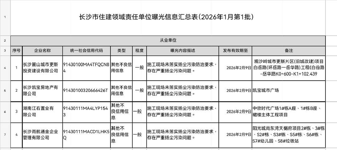 华声在线1月9日讯(记者 王文)今日,长沙市住建局发布2026年1月第1批住建领域责任单位曝光信息,4个项目因未落实扬尘污染防治要求、存在严重扬尘污染问题被公开通报,旨在压实企业环保主体责任,助力打赢蓝天保卫战。