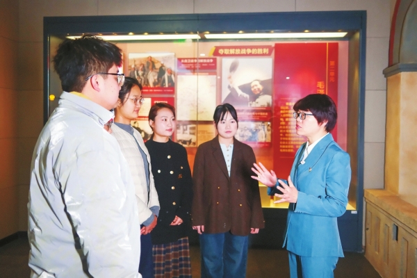 2025年12月31日,湘潭大学“大思政课”实践教学基地——毛泽东思想专题展的展厅内,李伏清(右一)在为学生进行专题授课。华声在线全媒体记者 童臻熙 摄