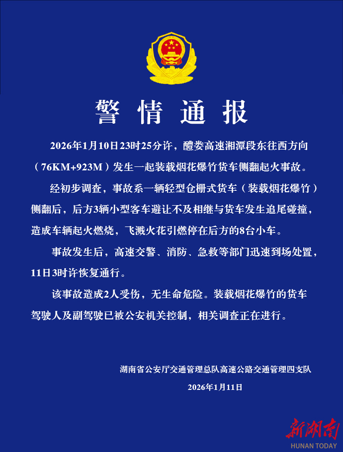 该事故造成2人受伤,无生命危险。装载烟花爆竹的货车驾驶人及副驾驶已被公安机关控制,相关调查正在进行。