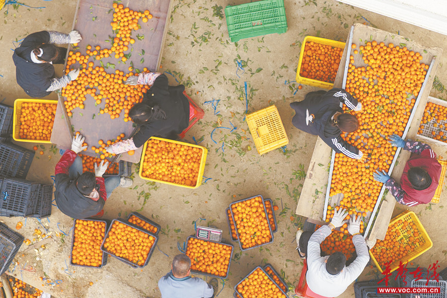 1月13日,嘉禾县珠泉镇沙坪村,村民在分拣、装运砂糖橘。时下,该村600多亩砂糖橘迎来丰收季,村民忙着采摘、分拣、装车,供应市场。