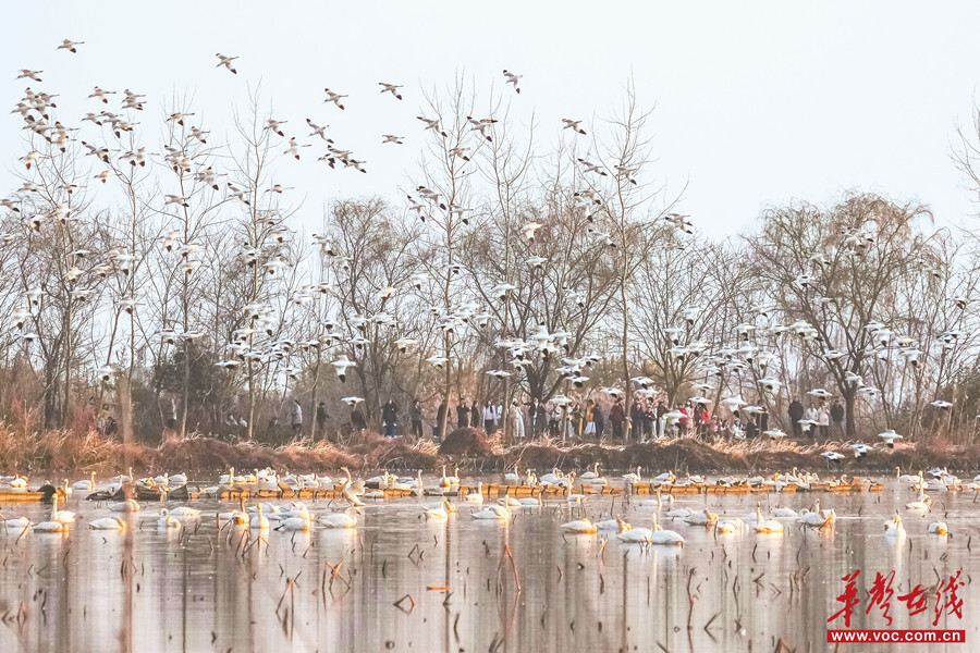 1月11日,成群候鸟在岳阳市屈原管理区东古湖栖息翱翔,吸引不少观鸟爱好者来此“追鸟”。