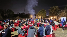 本报综合 因足球结缘,凭真情相聚!14日晚,为答谢江苏“十三太保”对永州的热忱支持,永州市冷水滩区珊瑚街道水汲江社区居民备好年猪饭,宴请江苏网友。
