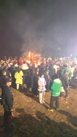 12日晚,记者在呆呆家门口看到了热闹非凡的一幕:来自全国各地的网友们在吃饱喝足后,在田地里围着篝火跳舞,唱歌;自媒体创作者们举着手机记录着,线上网友们的评论在刷屏,很多人表示很羡慕现场的热闹,称很有年味。