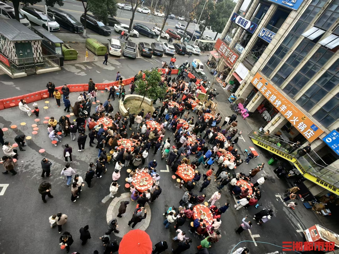流水席一桌接一桌地开,刚坐下不久,又有人端着碗筷加入。熟悉的、不熟悉的邻居坐在一起,从“你住几栋”聊到“今年过年回不回老家”……一顿饭下来,原本只是点头之交的邻里,渐渐熟络起来。