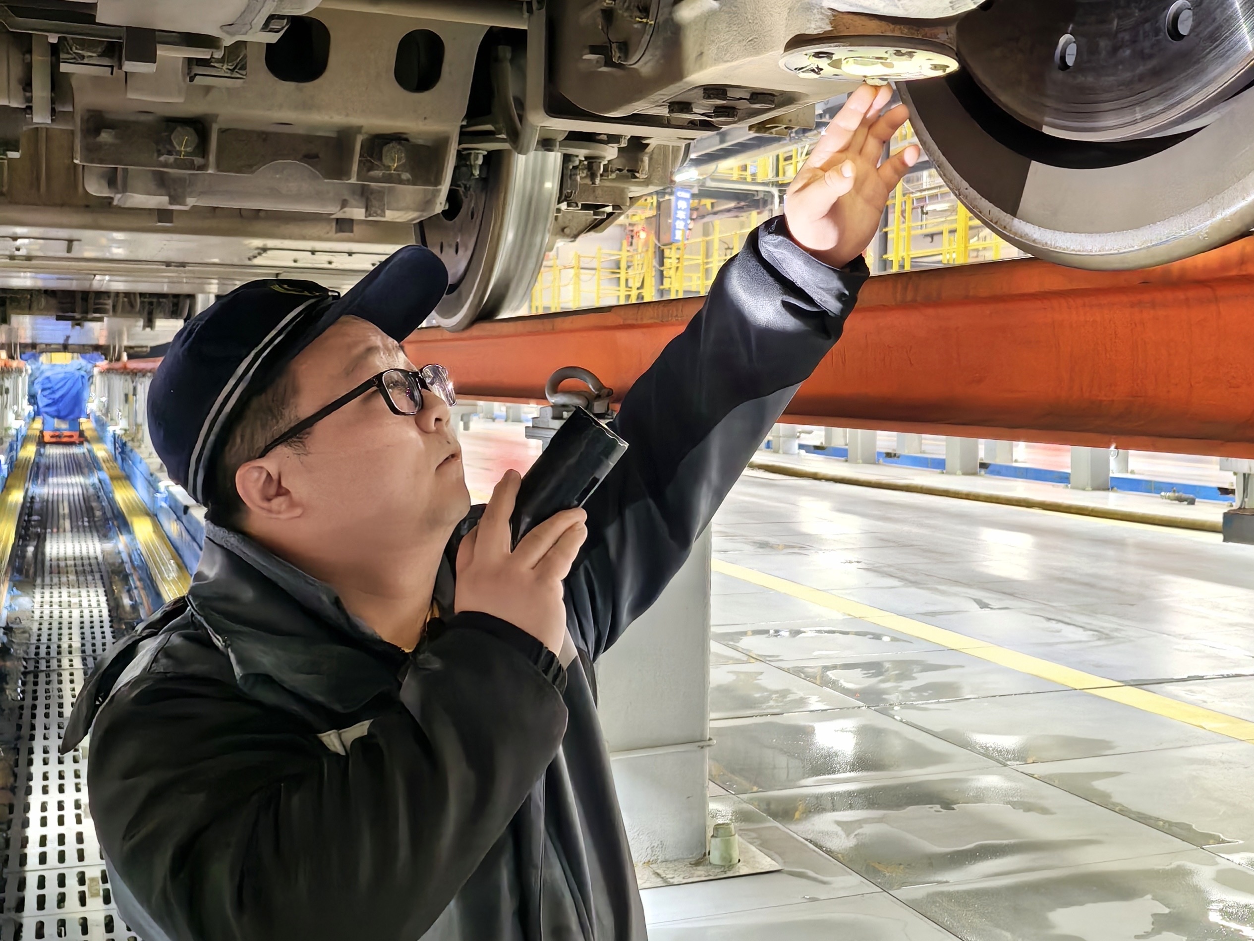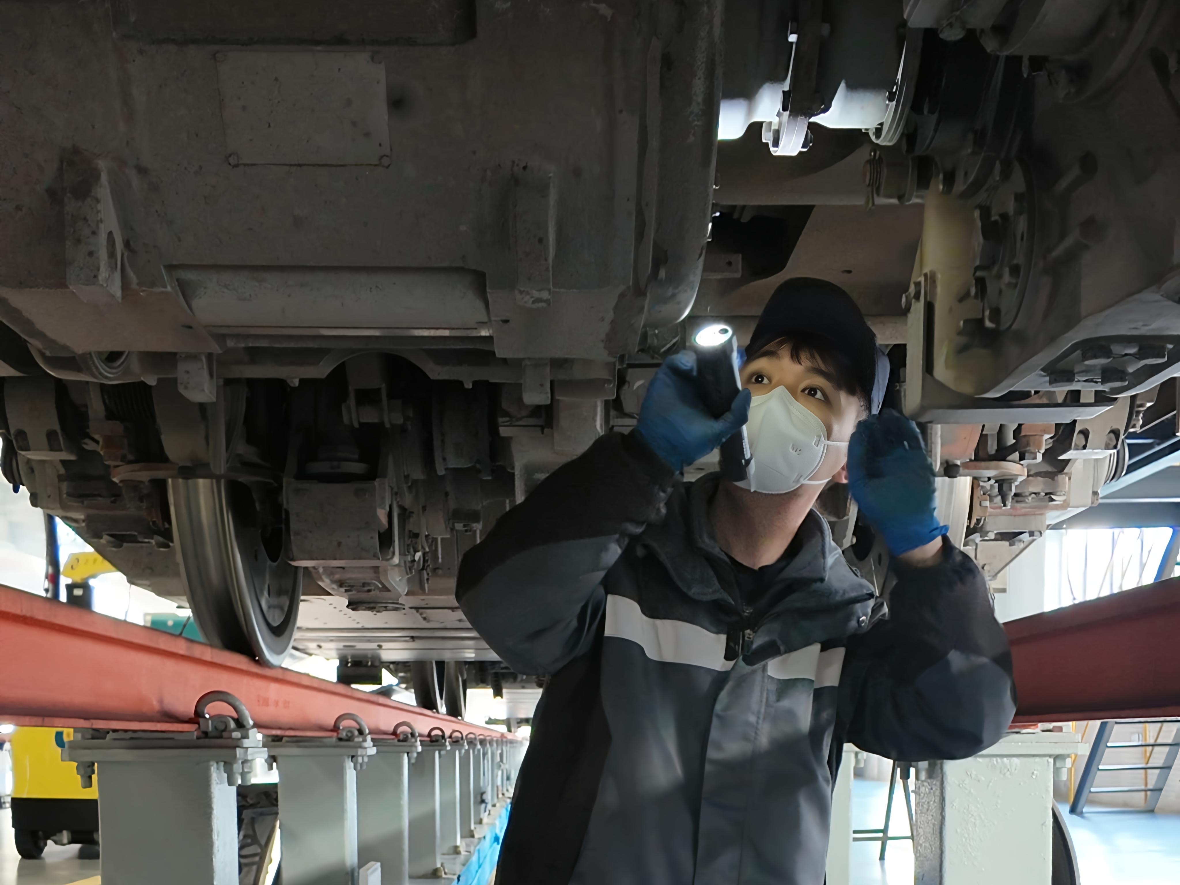 (机械师正在进行地沟作业,检查车组转向架。通讯员供图)