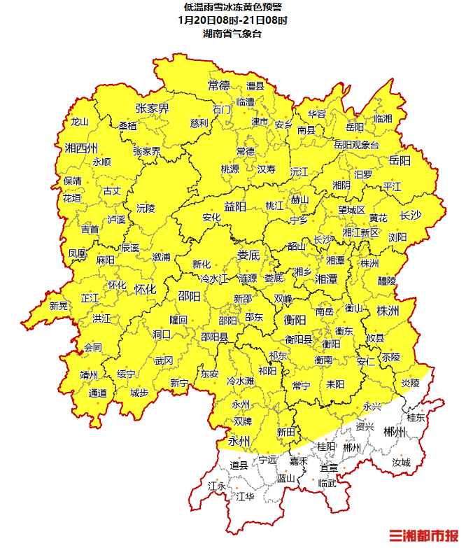 华声在线1月20日讯(全媒体记者 李致远 通讯员 林城)湖南省气象台1月20日7时发布低温雨雪冰冻黄色预警:预计20日8时至21日8时,全省大部分地区将出现冻雨、雨夹雪或雪,且最低气温将低于0℃。