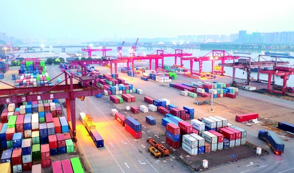 暮色下的长沙新港码头一片繁忙景象。辜鹏博 摄