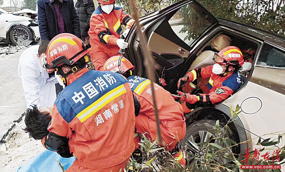 1月20日,临澧县望城街道,两辆小车因冰雪路面湿滑发生碰撞,导致车体变形、两人被困。县消防救援大队赶赴现场,在风雪中破拆车辆,成功救出被困人员。
