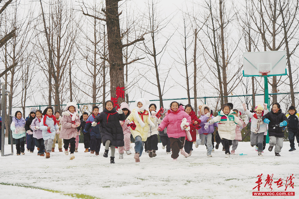 1月21日,双峰县曾国藩学校,学生们在课间走出教室,尽情享受玩雪的乐趣。