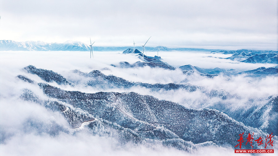 1月23日,新田县门楼下瑶族乡九峰山,山巅耸立的风力发电机组与皑皑白雪、翻腾云海相映成趣,构成一幅独特的生态画卷。近年来,该县依托风能资源优势,大力发展风电等清洁能源,促进绿色低碳发展。