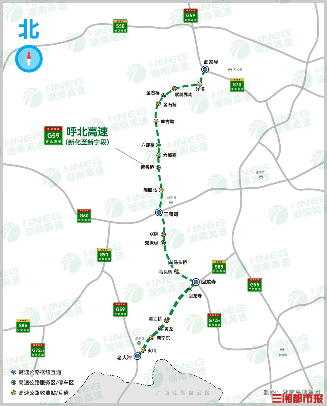 1月26日,G59呼北高速新化至新宁段建成通车。一条贯通湘中、湘西南的南北向高速通道投入使用,区域出行条件迎来新的变化。G59呼北高速新化至新宁段,北起湖南娄底市新化县青山乡卿家屋,途经娄底市新化县,邵阳市隆回县、武冈市、邵阳县、新宁县,止于邵阳市新宁县老人冲,主线全长192.564公里。