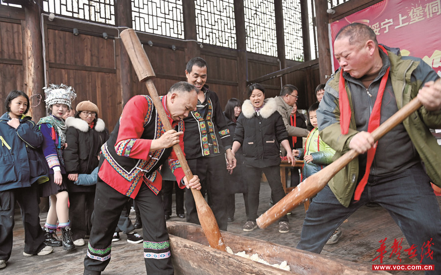 1月26日,绥宁县寨市苗族侗族乡上堡村,村民正在打糍粑。春节临近,当地村民纷纷开展打糍粑、磨豆腐、腌腊菜等传统民俗活动。