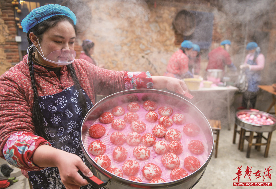 1月26日,宁远县舜陵街道和谐社区,居民正在赶制传统年节食品——红粑。春节临近,该县进入传统年节食品制作旺季。