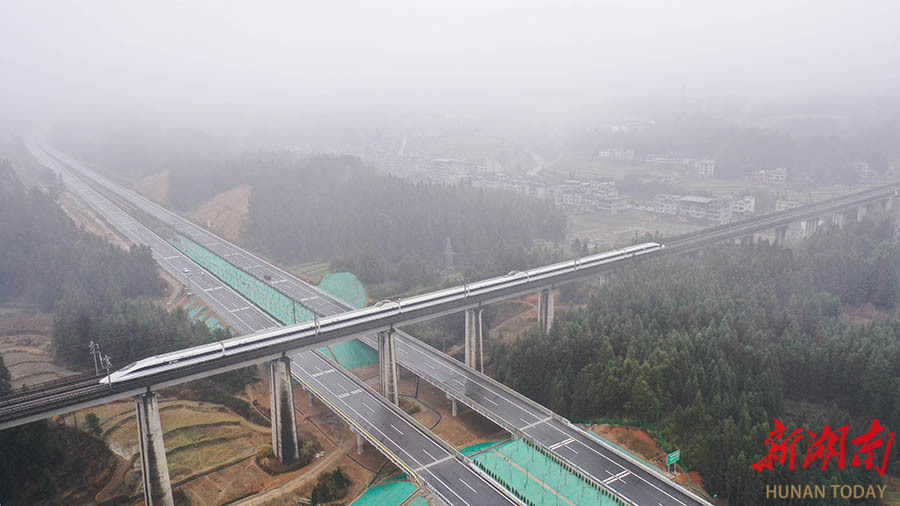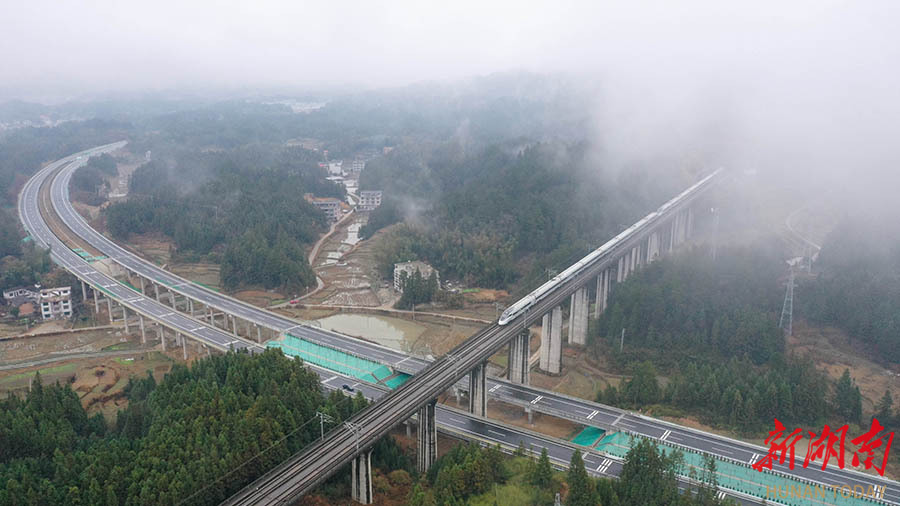 1月26日,隆回县金石桥镇月山村,沪昆高铁列车从刚刚通车的G59新新高速上方飞驰而过,构成了一幅立体交通网的时代图景。当天,G59呼北高速新化至新宁段(新新高速)正式通车。该项目路线全长192.3公里,设计时速100-120公里,北起娄底新化县,南至邵阳新宁县,途经隆回县、武冈市等地。其建成通车将湘中至湘西南地区的车程从约6小时缩短至2小时左右,显著改善了区域交通条件,为对接粤港澳大湾区、促进沿线