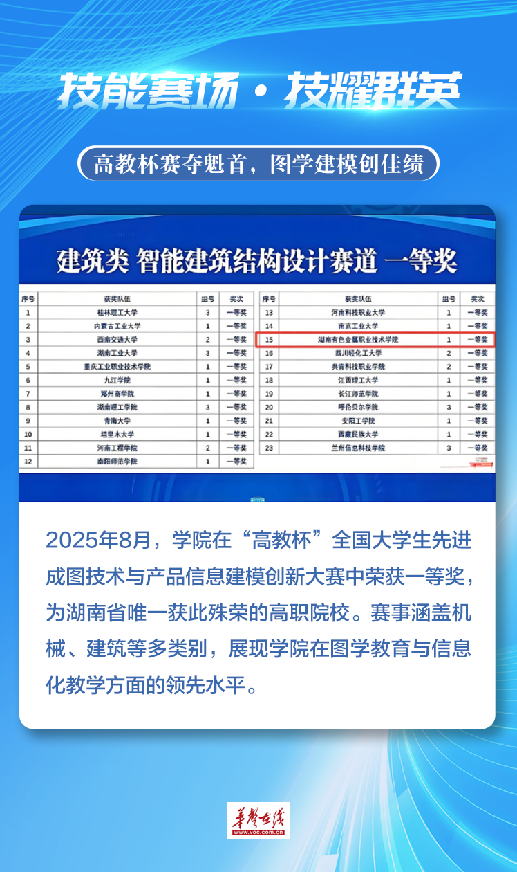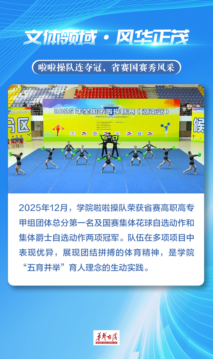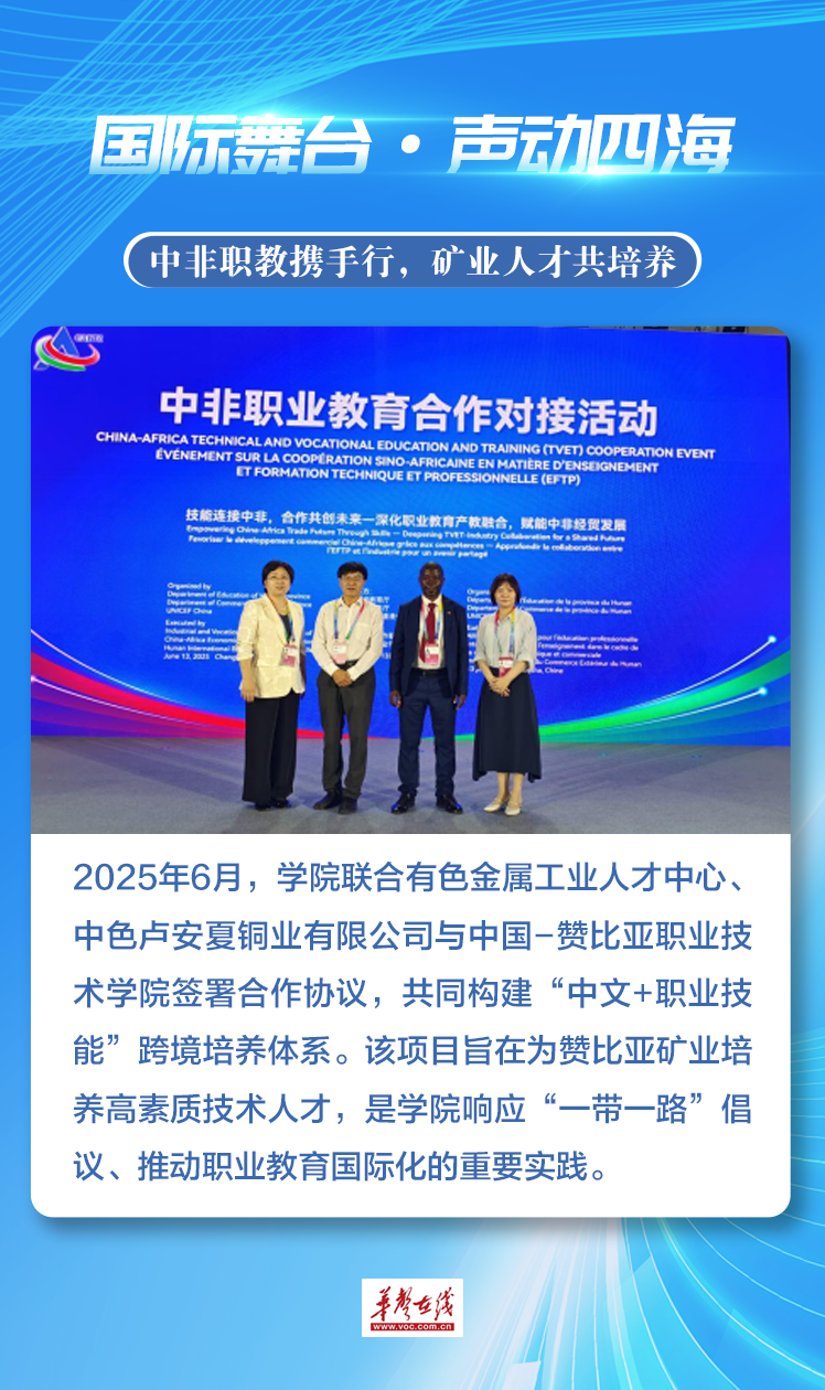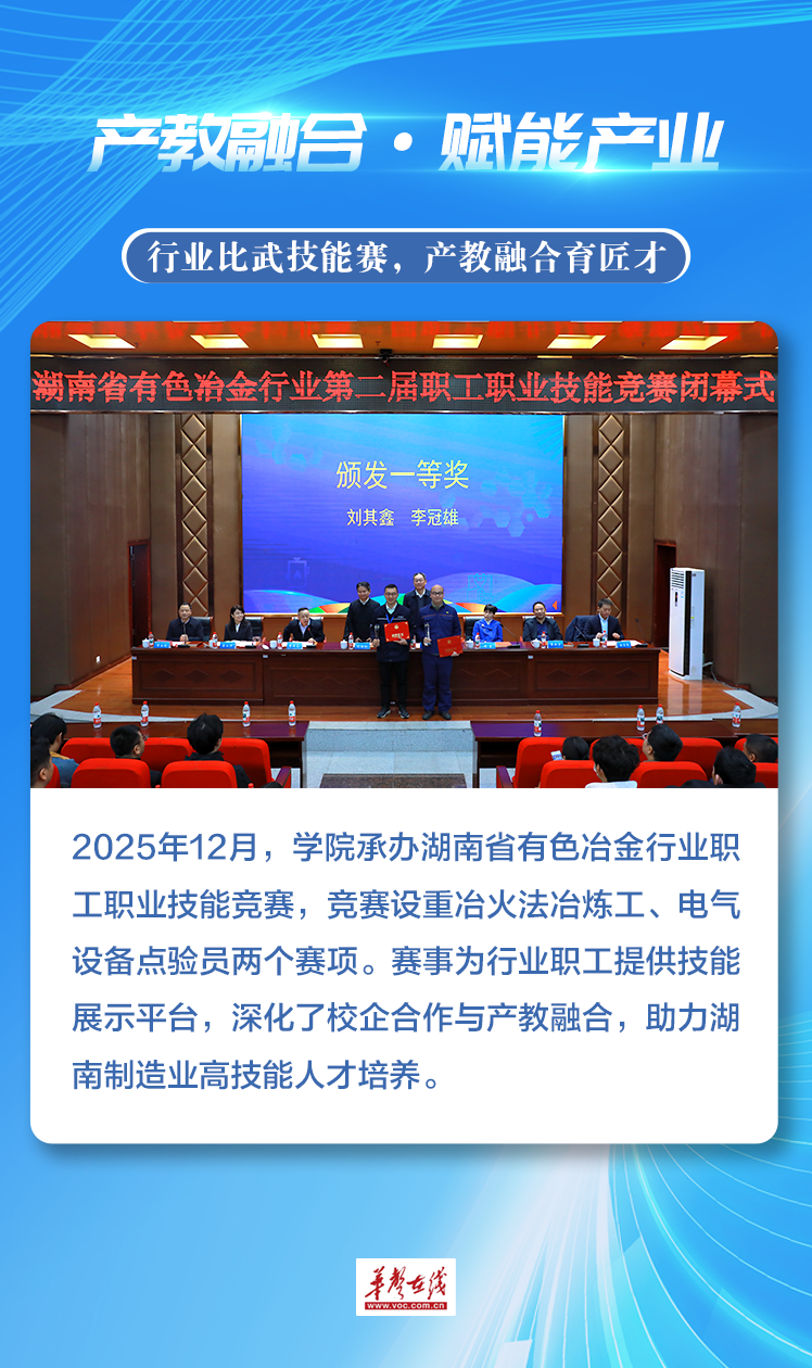 2025年,湖南有色金属职业技术学院以昂扬姿态、实干作风,交出沉甸甸年度答卷。这一年,学院技能赛场摘金夺银,产教融合深化担当,国际舞台绽放光彩,文体领域屡创佳绩。每一步都镌刻着 “有色人” 砥砺奋进的足迹,既铭刻奋斗高光时刻,更彰显学院培育高素质技术技能人才、服务产业与区域发展的坚实力量。