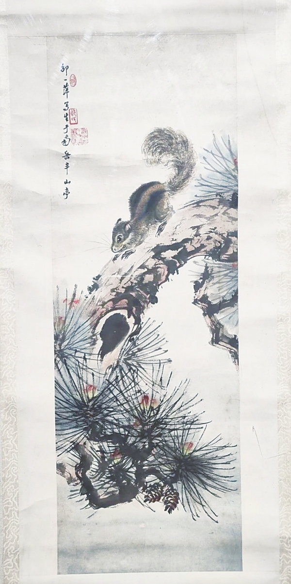 写生于南岳山亭的《松鼠图》,一棵苍劲的松干斜穿画面,下部繁茂的松针肆意生长,疏密相间,与上部远处点缀的少量松针回环呼应,将画面视觉集中在匍匐于树干上的松鼠。小动物眼神坚定,四肢紧伏,似乎发现了隐藏在松针里的果实,鼠身在墨的浸染下尽显真实,鼠尾则以丝毛技法绘制,造型憨态可掬,大笔写就的树干与写实勾勒的松鼠既是虚与实的对比,也是工与写的结合。
